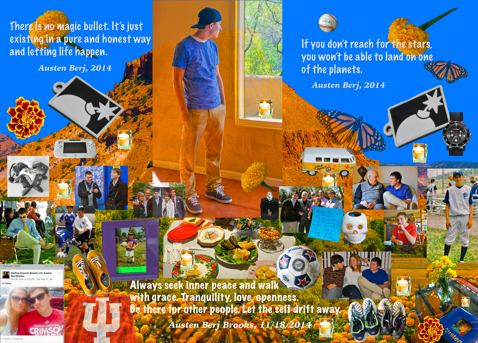 After seeing a Dia de los Muertos exhibit in Tucson, I was inspired to create that November 2015 post, which helped me to look outside myself and focus on Austen’s spiritual journey, his favorite foods and mementos, as the 1st year anniversary of his death approached. This year, the 7th anniversary of Austen’s death, the gallery in the warehouse where I have a studio put on a Dia de los Muertos Exhibit – A Celebration of Souls. For the exhibit, I decided to try my hand at creating a photo collage Ofrenda for Austen, focusing not just on his spirituality but his physical presence, his concrete love of sports, playing video games, his deep intelligence, his shoes, his cologne, his favorite foods, the importance to him of his family, and the love and respect we all shared for one another.